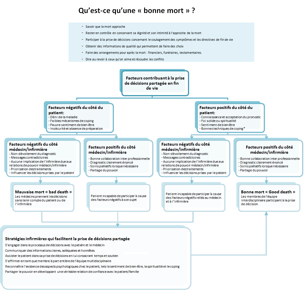 Un lien très fort existe entre la prise de décisions « partagée » en fin de vie et une bonne mort. Se basant sur les facteurs qui influencent ce processus de prise de décisions « partagée », l’auteur de la revue de littérature a développé un modèle pouvant servir de guide aux infirmières qui veulent participer à la prise de décisions en fin de vie.