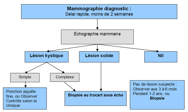 Sinon, on procède d'emblée chez les jeunes patientes à une échographie et une biopsie de la zone suspecte visible à l'échographie (écho-guidage). Les lésions kystiques symptomatiques ou complexes à l’échographie sont référées pour une biopsie d’aspiration : si le liquide est sérosanguinolent, on procède à la biopsie car le risque de cancer est augmenté.
