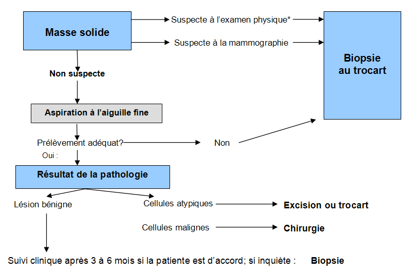 Le triple diagnostic Schéma 3 réfère à l’association des 3 techniques d’examen pour l’évaluation d’une masse solide au sein : l’examen physique, la mammographie et la biopsie fine à l’aiguille. Très peu de cancers sont manqués ainsi, soit 0, 7 %, lorsque ces 3 examens suggèrent une lésion bénigne et que le prélèvement est de quantité suffisante . Lorsqu’un de ces examens suggère un cancer, la patiente devra alors subir une biopsie au trocart ou une biopsie excisionnelle. Le Schéma 3 résume ceci. Idéalement, toute masse suspecte à l’examen physique ou à l’échographie devra subir une biopsie au trocart sous échographie ou stéréotaxie.